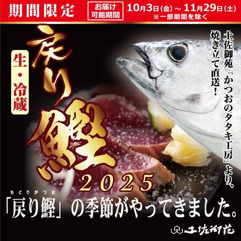 また、通常は冷凍でお送りしているタタキですが、新鮮な戻り鰹を美味しく召し上がっていただけるように【生・冷蔵便】にてお届けいたします!